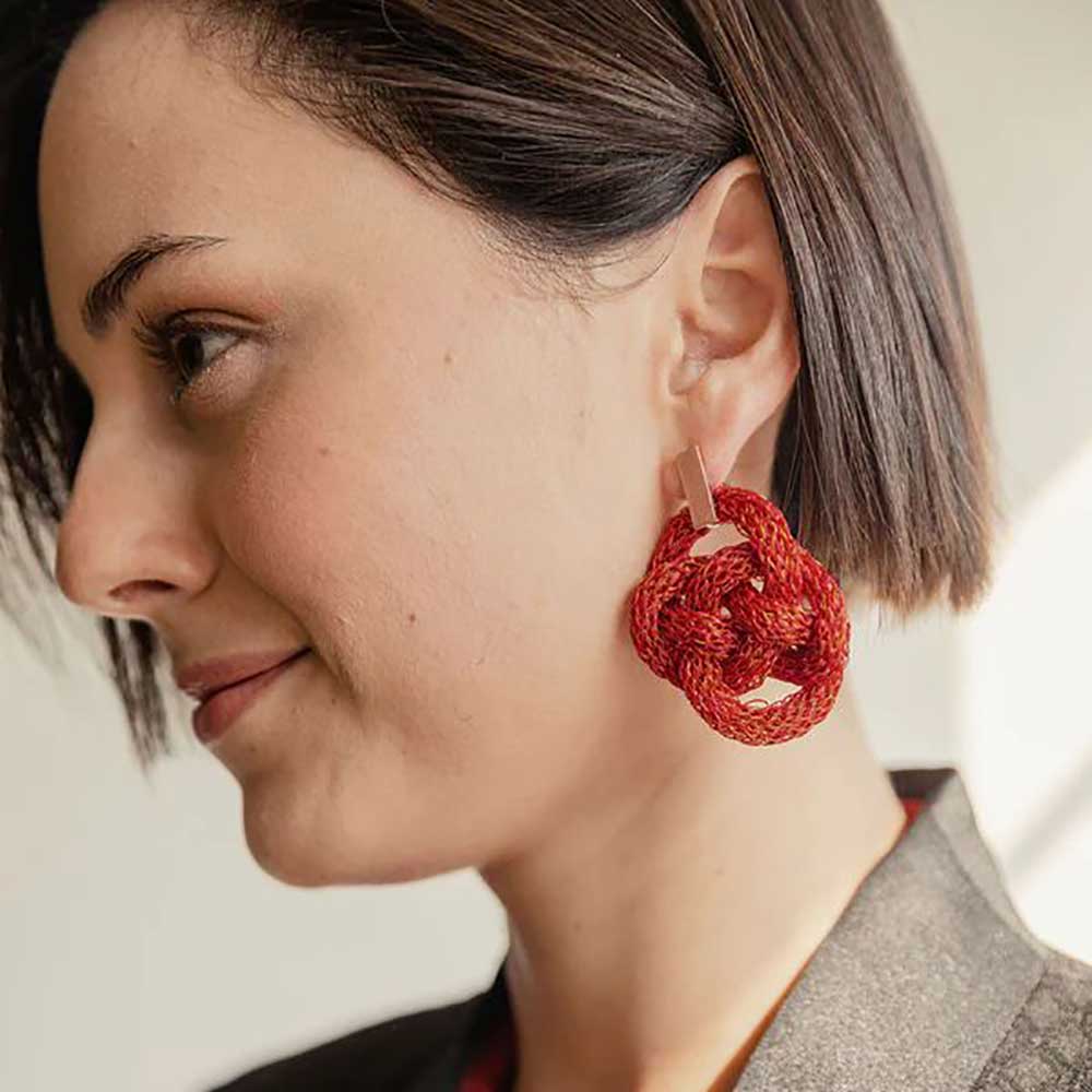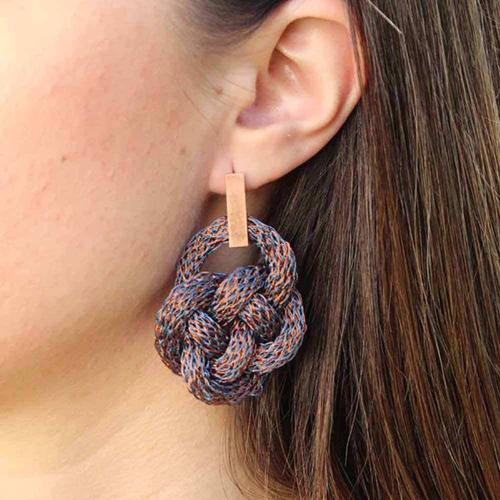Infinity knot hoops earrings, woven in copper wire and coloured threads. The fabric is enamelled copper wire and polyamide thread. The ring support is copper and the post and closures are sterling silverre silver.