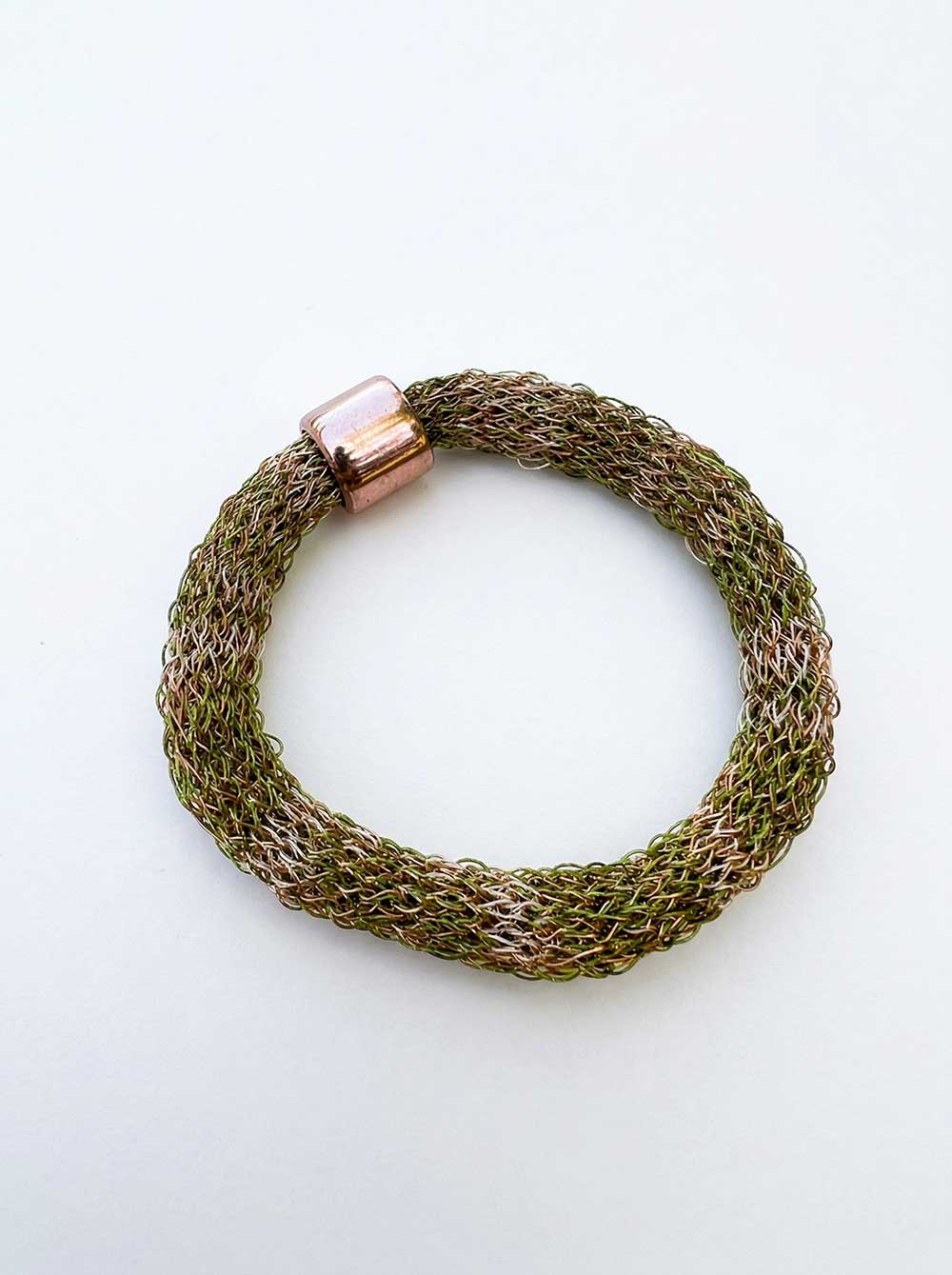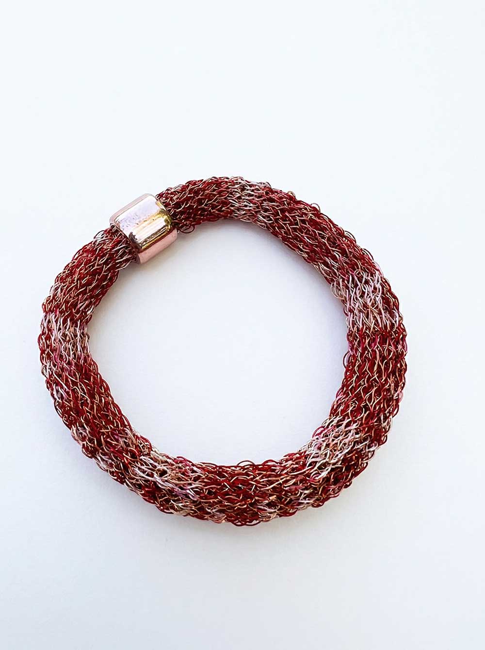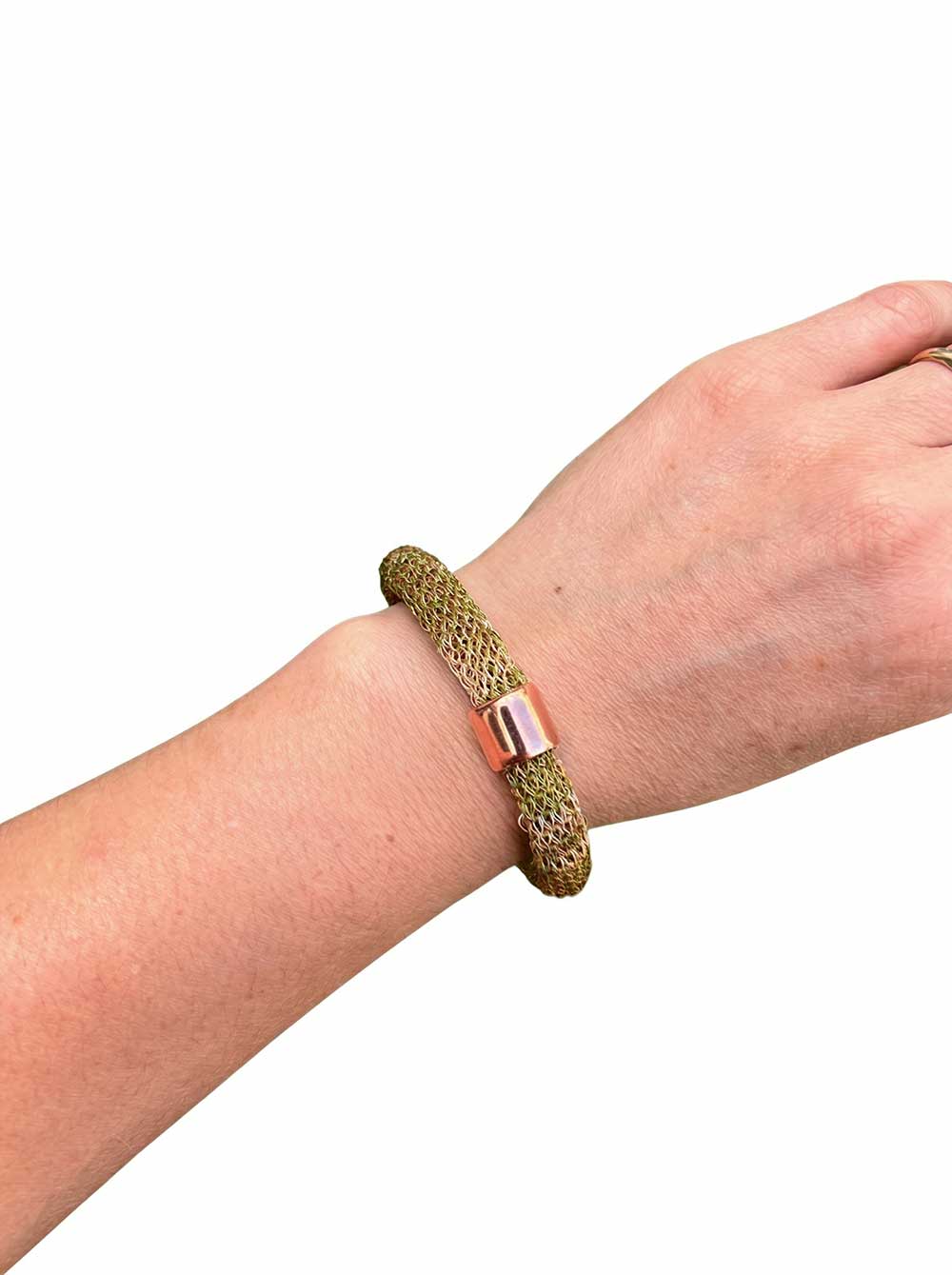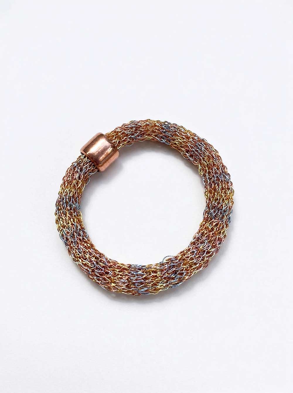Single bracelet woven in copper wire and thread, a single thick cord that is held together with the application of a ring of copper tubing fixed with hand stitching.  This bracelet is very versatile:  it can be worn and a cord, or you can open the mesh up to wear as a ticker bracelet.  The mesh can be rolled in as a cord again with no effort!
