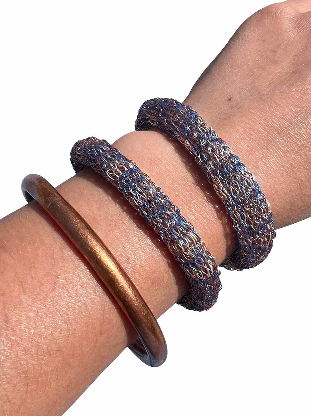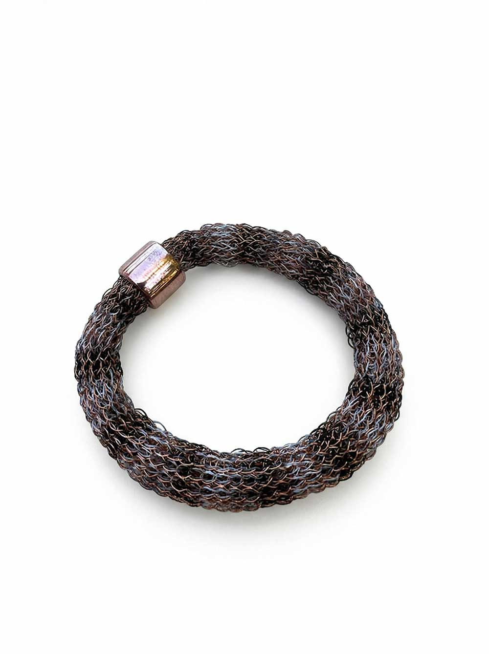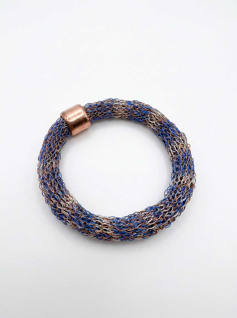 Single bracelet woven in copper wire and thread, a single thick cord that is held together with the application of a ring of copper tubing fixed with hand stitching.  This bracelet is very versatile:  it can be worn and a cord, or you can open the mesh up to wear as a ticker bracelet.  The mesh can be rolled in as a cord again with no effort!