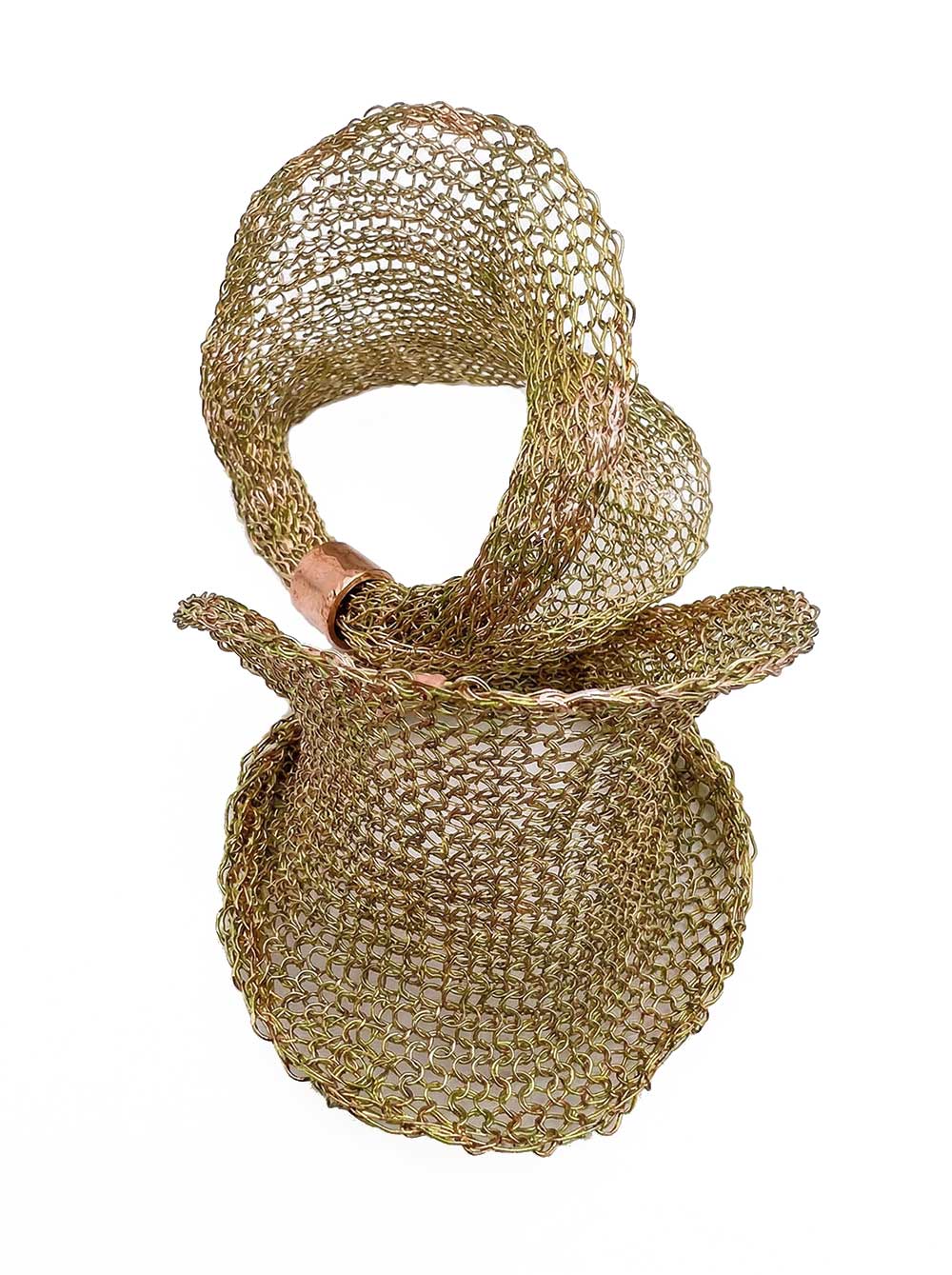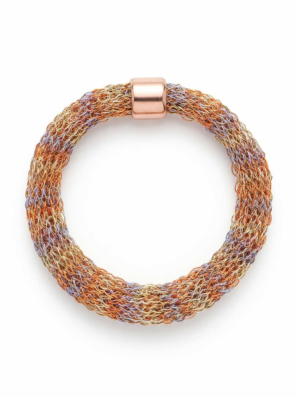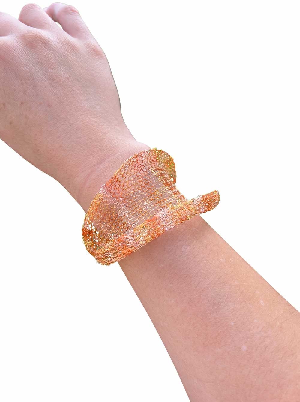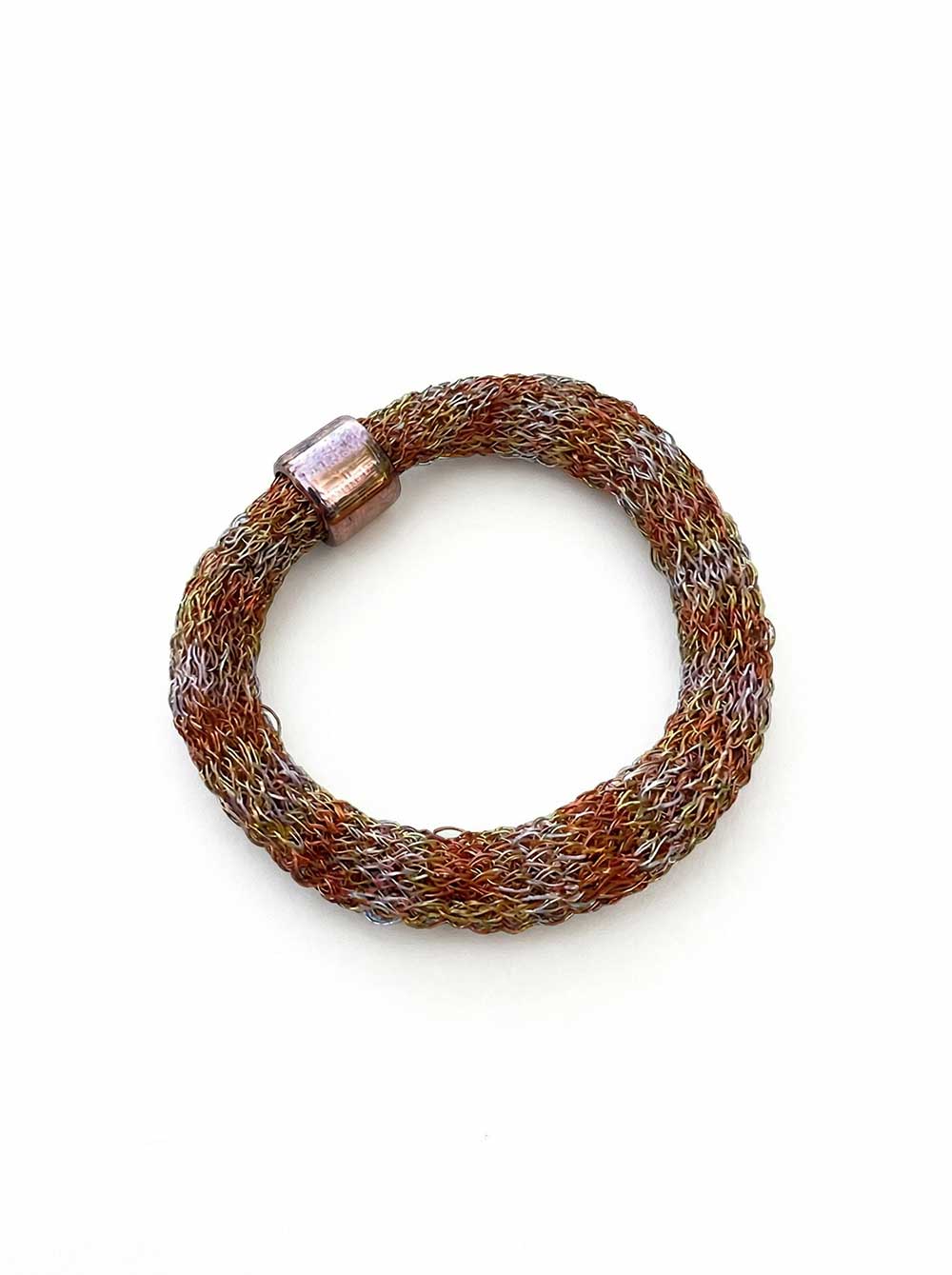 Single bracelet woven in copper wire and thread, a single thick cord that is held together with the application of a ring of copper tubing fixed with hand stitching.  This bracelet is very versatile:  it can be worn and a cord, or you can open the mesh up to wear as a ticker bracelet.  The mesh can be rolled in as a cord again with no effort!