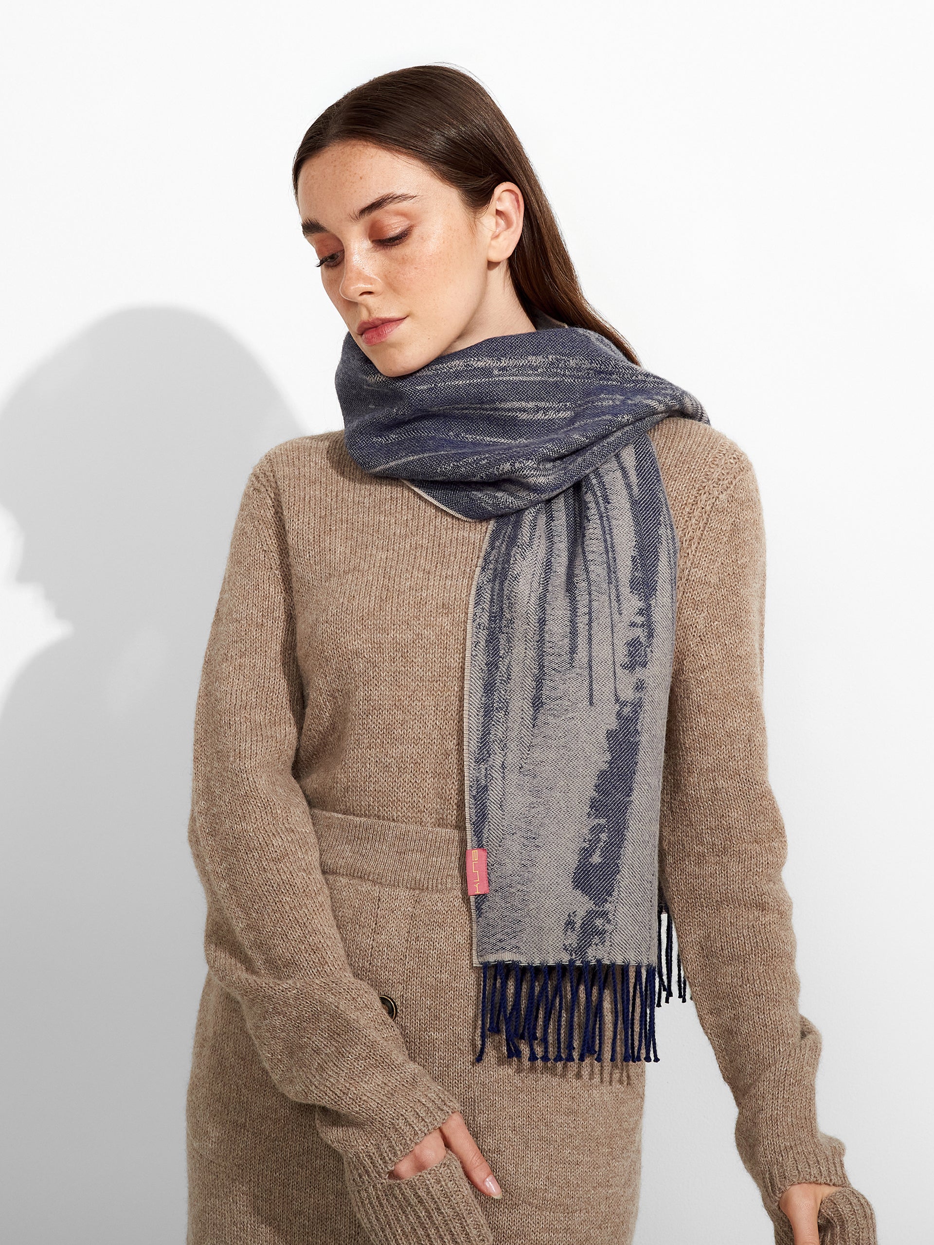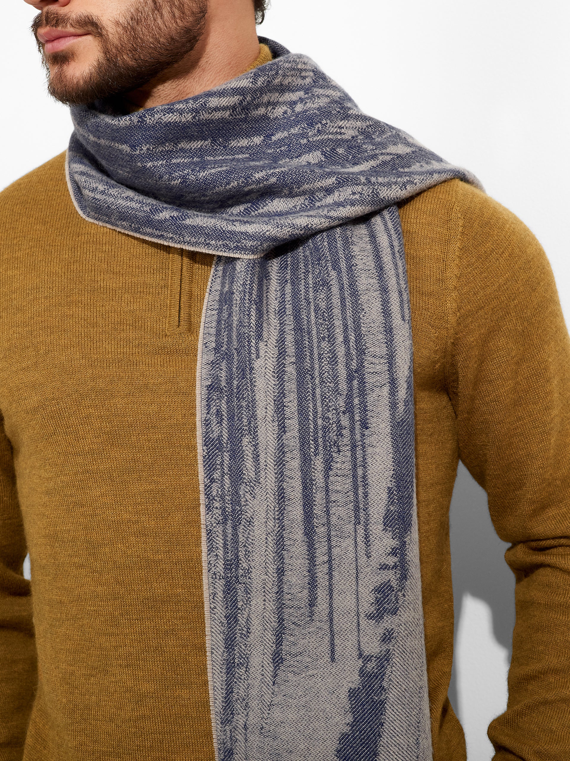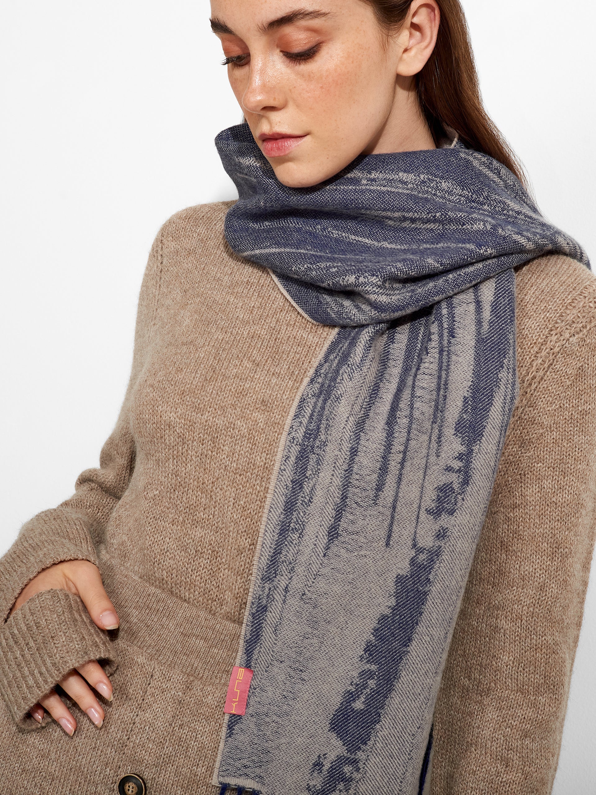 Designed in a rich blue or black tone with an abstract pattern, the Zangay scarf stands out for its artistic character and dynamic visual texture. The modern motif adds depth and movement, while contrasting fringed edges provide an artisanal finish that enhances its handcrafted appeal.